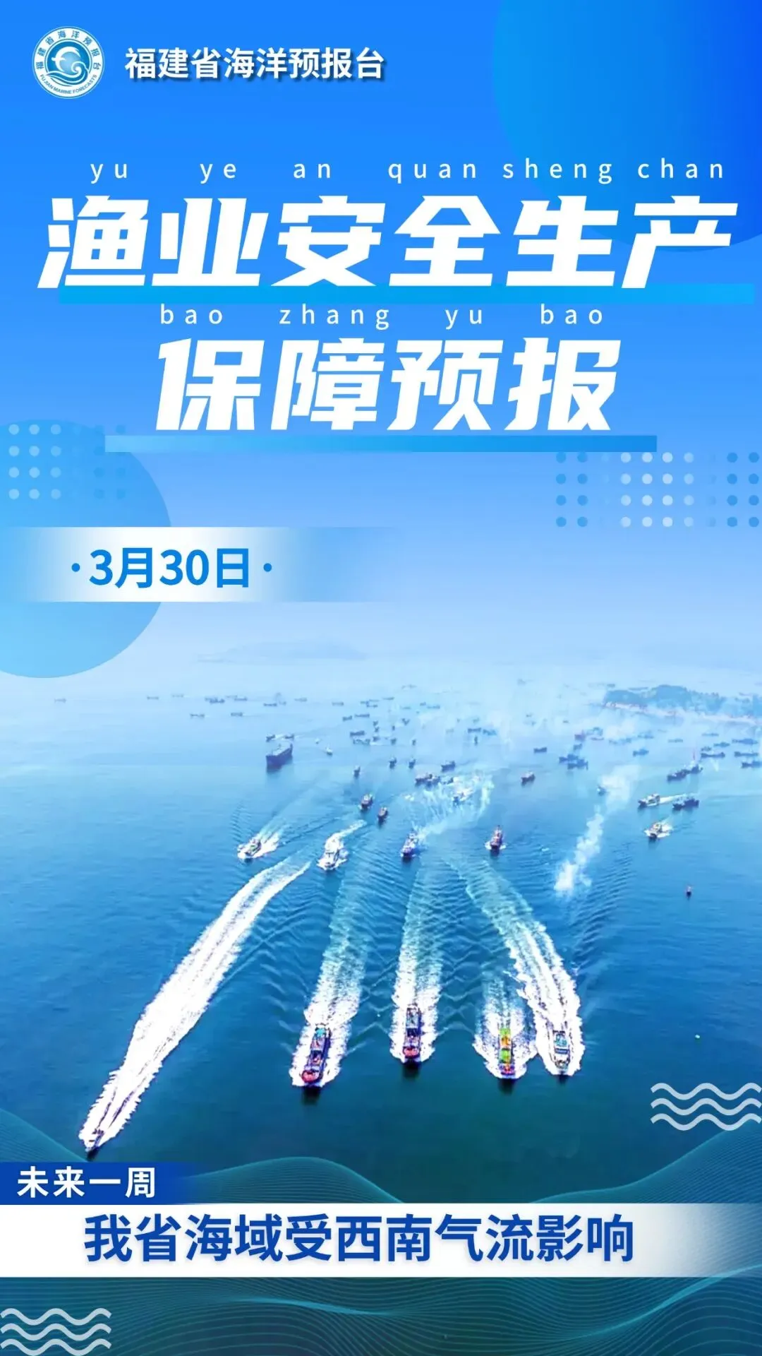 未来一周西南气流影响我省海域。4月3-4日,受出海气旋外围影响,闽东渔场、闽外渔场、闽中渔场和钓鱼岛海域风浪较大。