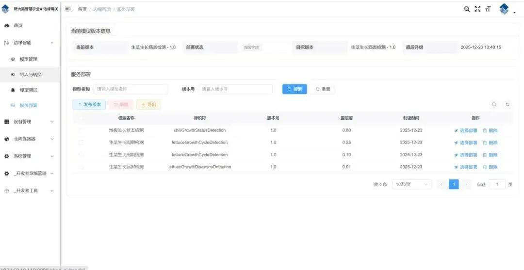 ● 将训练好的模型一键部署到AI边缘网关,在真实场景中完成作物识别、环境联动等任务。