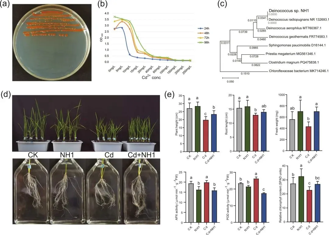 图1. 耐镉且促进植物生长的NH1菌株的分类特征及其对水稻对镉胁迫抗性的影响。(a) NH1菌株的菌落形态特征。(b) 24–96小时内NH1菌株的最大镉耐受浓度。(c) 基于16S rRNA基因的NH1菌株系统发育特征。(d) 在土壤栽培条件下,施加 NH1 应变对水稻地上和地下部分形态的影响。(e)在土壤培养条件下施加NH1应激对水稻生长及生理指标的影响(Duncan’s多重范围测试,p<0.05)。 CK:施用5ml无菌水;NH1:在1.0×106 CFU/mL下施加5ml细胞悬浮液;Cd:在水稻播种前以10 mg/kg的速率用Cd2+溶液处理土壤;Cd+NH1:基于Cd组,施加5ml细胞悬浮液,浓度为1.0×106 CFU/mL。