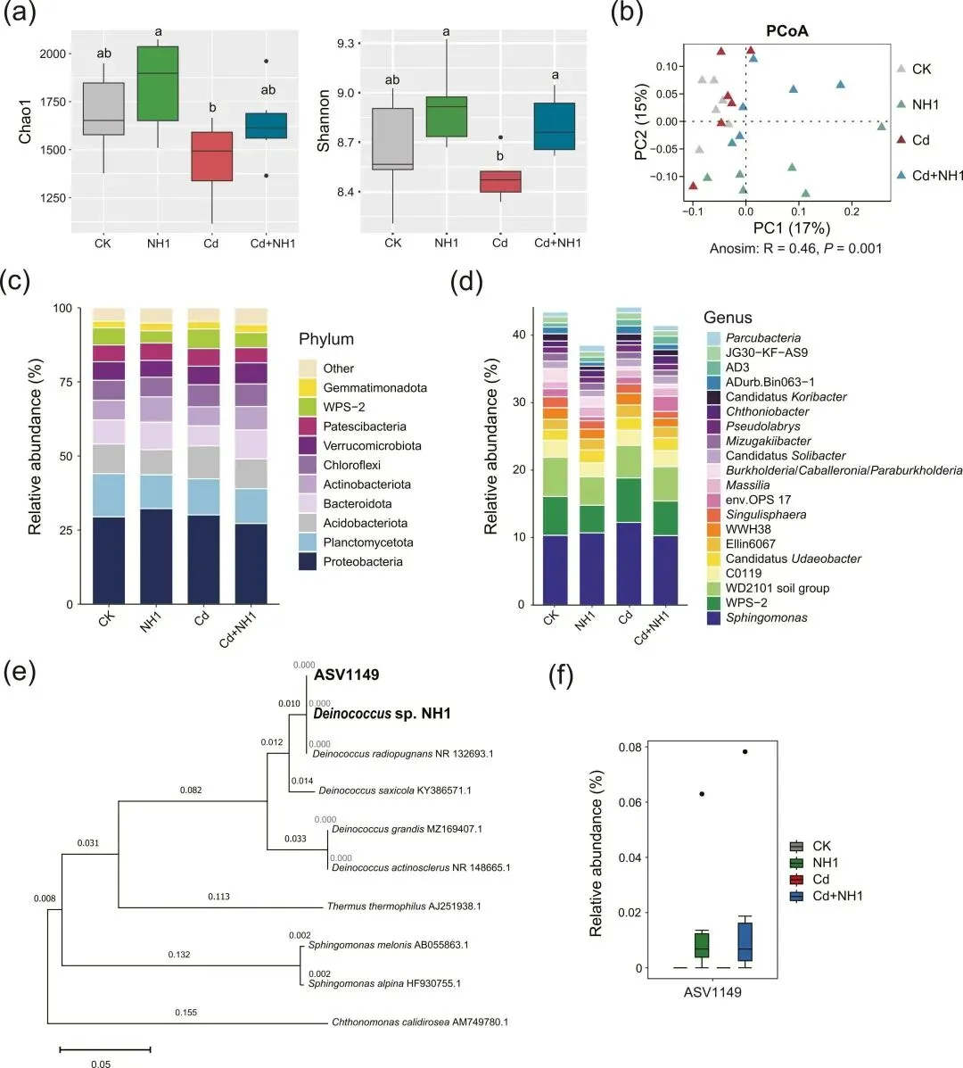 图2 Deinococcus sp. NH1 在镉处理下对稻米根际细菌群落的影响。(a) NH1菌株对稻米根际细菌群落α多样性的影响(Duncan多重范围测试,p<0.05)。(b) NH1菌株对稻米根际细菌群落β多样性的影响。(c) 稻米根际细菌群落在门水平组成变化,受NH1菌株影响。(d) 稻米根际细菌群落在属水平的组成变化,受NH1菌株影响。(e)ASV1149和菌株NH1的系统发育树。(f) 处理组间ASV1149的相对丰度。