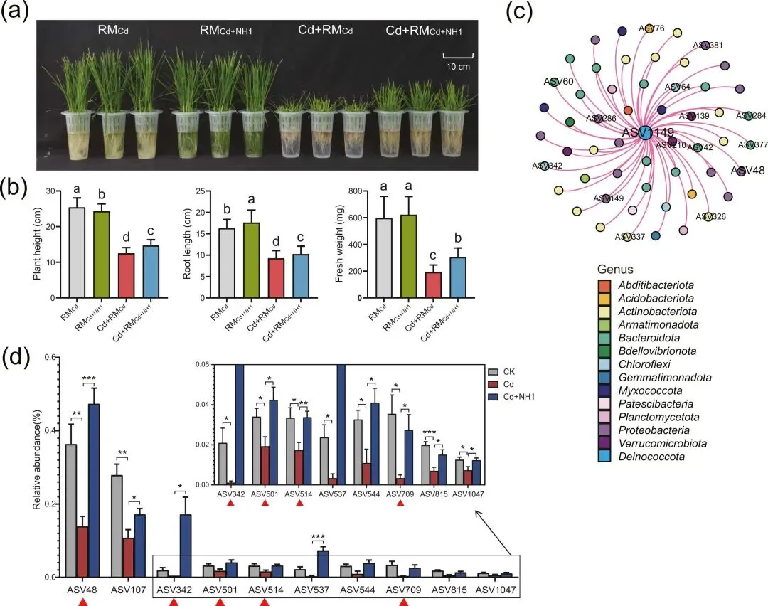 图3.稻米根际细菌群落在镉暴露下对NH1菌株的反应模式。(a)施用由Cd或Cd+NH1处理组富集的根际微生物群落施用后14天内的稻幼苗生长状态。(b) 富含Cd或Cd+NH1的根际微生物群落对水培条件下稻米生长的影响(Duncan,p<0.05)。RMCd:来自Cd处理组的根际土壤悬浮液(5ml 10%悬浮液);RMCd+NH1:来自Cd+NH1处理组的根际土壤悬浮液(5ml 10%悬浮液)。Cd+RMCd:使用CdCl2溶液,达到10 mg/kg的Cd2+浓度,并添加5 mL 10%根际土壤悬浮液,均来自Cd处理组。Cd+RMCd+NH1:Cd+NH1处理组10 mg/kg的Cd2+和5ml 10%根际土壤悬浮液。(c) ASVs与ASV1149(Deinococcus属NH1)呈显著正相关。(d)“恢复型”ASV与ASV1149相关(用红色三角形标注为“响应式”ASV)(*p < 0.05,**p < 0.01,***p < 0.001)。