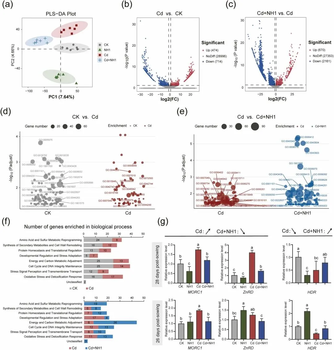 图4. 镉处理下, NH1菌株对稻根基因表达的影响。(a)部分最小二乘判别分析(PLS-DA),显示四种处理间存在显著的转录组差异。(b) 火山图显示镉处理下基因显著上调/下调(Cd vs. CK)。(c) 在共处理(Cd+NH1 vs. Cd)下,差异表达基因的火山图。(d) 生物过程中镉响应基因(Cd 与 CK)的富集分析。(e)生物过程中NH1调控基因(Cd+NH1 vs. Cd)的富集分析。(f) Cd与CK及Cd+NH1与Cd比较中富集生物过程的分类统计。(g) RT-qPCR结果图,显示第二次施用NH1菌株处理后5天和7天(即播种后26天和28天)水稻根中应激响应基因的表达水平。