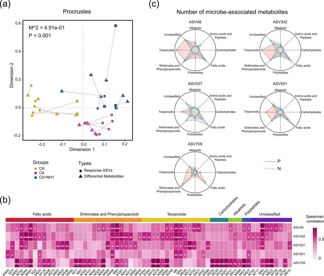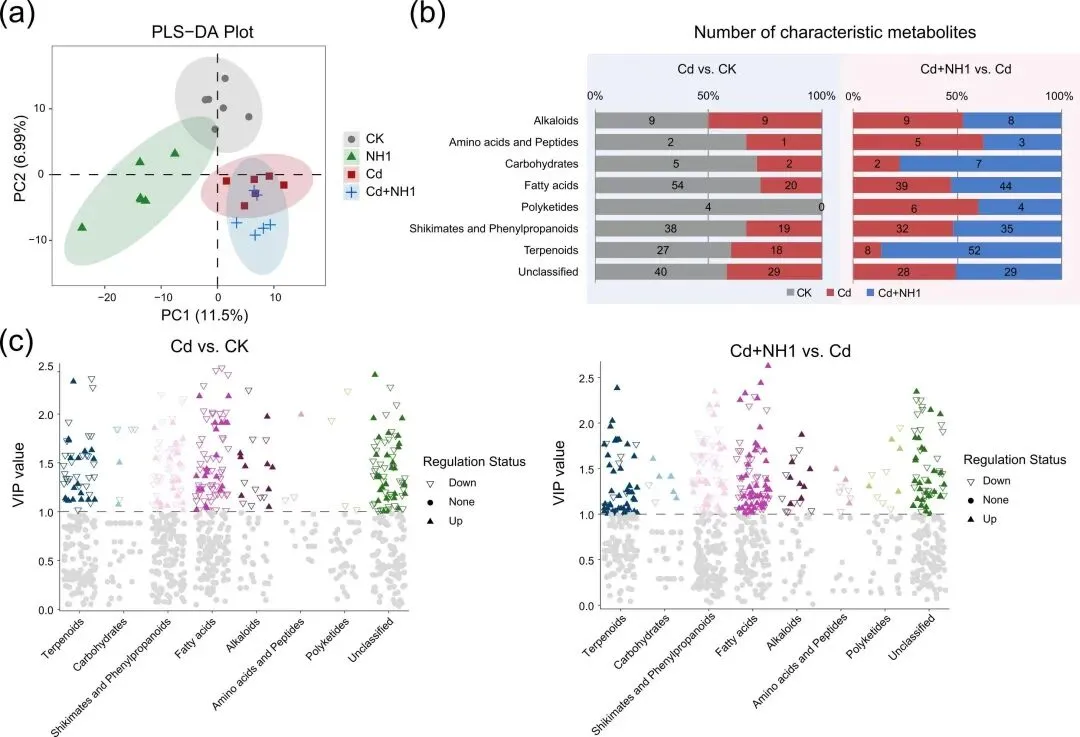 图5.NH1菌株对镉处理下稻米根际代谢物谱的影响。(a)部分最小二乘判别分析(PLS-DA)显示四种处理方法在代谢物谱上存在显著差异。(b)组间成对比较中VIP>为1的特征代谢产物数量统计(Cd与CK,Cd+NH4与Cd)。(c) 特征代谢产物在不同物质类别中的分布。