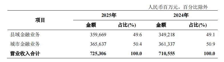 金融服务乡村振兴更加聚焦扎实。县域贷款增速持续高于全行。全力支持乡村全面振兴和城乡融合发展,县域贷款年增量连续四年超万亿元,县域贷款余额从2020年末的5.31万亿元增至2025年末的10.94万亿元,县域贷款占全行贷款比重超过40%。县域手机银行月活客户数1.3亿户。