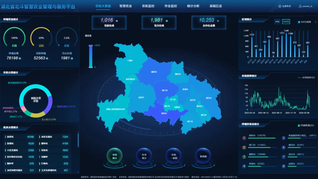 湖北省北斗智慧农业管理与服务平台立足湖北农业生产需求,构建全流程业务支撑体系。核心能力涵盖:农机实时监控、智能调度与精准派单,关键农时保障作业质量效率,精准核算作业面积;归集北斗农机、无人机及物联网农情数据,筑牢统一数据底座;具备订单管理、应急调度等功能,支撑全程机械化、综合农事服务及智慧农场示范,为农业产前产后各环节提供全方位保障。