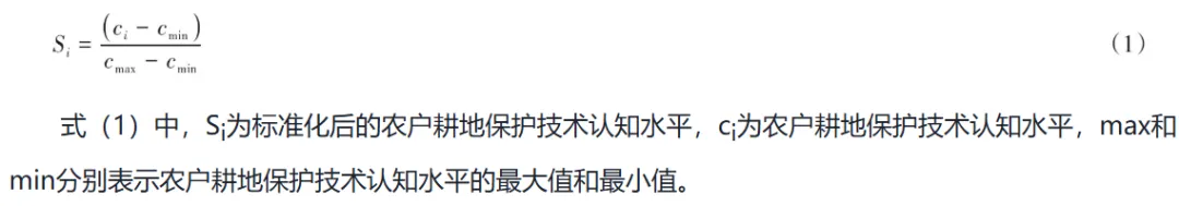 该文的机制变量是技术认知,将农户耕地保护技术认知分为3个层次。一是农户对技术本身的认知,通过“您了解耕地保护技术吗?”来测度;二是农户对技术的经济效益认知,通过“您认为耕地保护技术有利于增产或增收吗?”来测度;三是农户对技术的生态效益认知,通过“您认为耕地保护技术有利于改善土壤质量和环境保护吗?”根据农户上述问题的回答,将“非常不同意、比较不同意、一般、比较同意、非常同意”依次分别赋值“1、2、3、4、5”,将上述所有指标进行加权平均后得到农户的技术认知水平,最后再进行标准化处理,具体公式为: