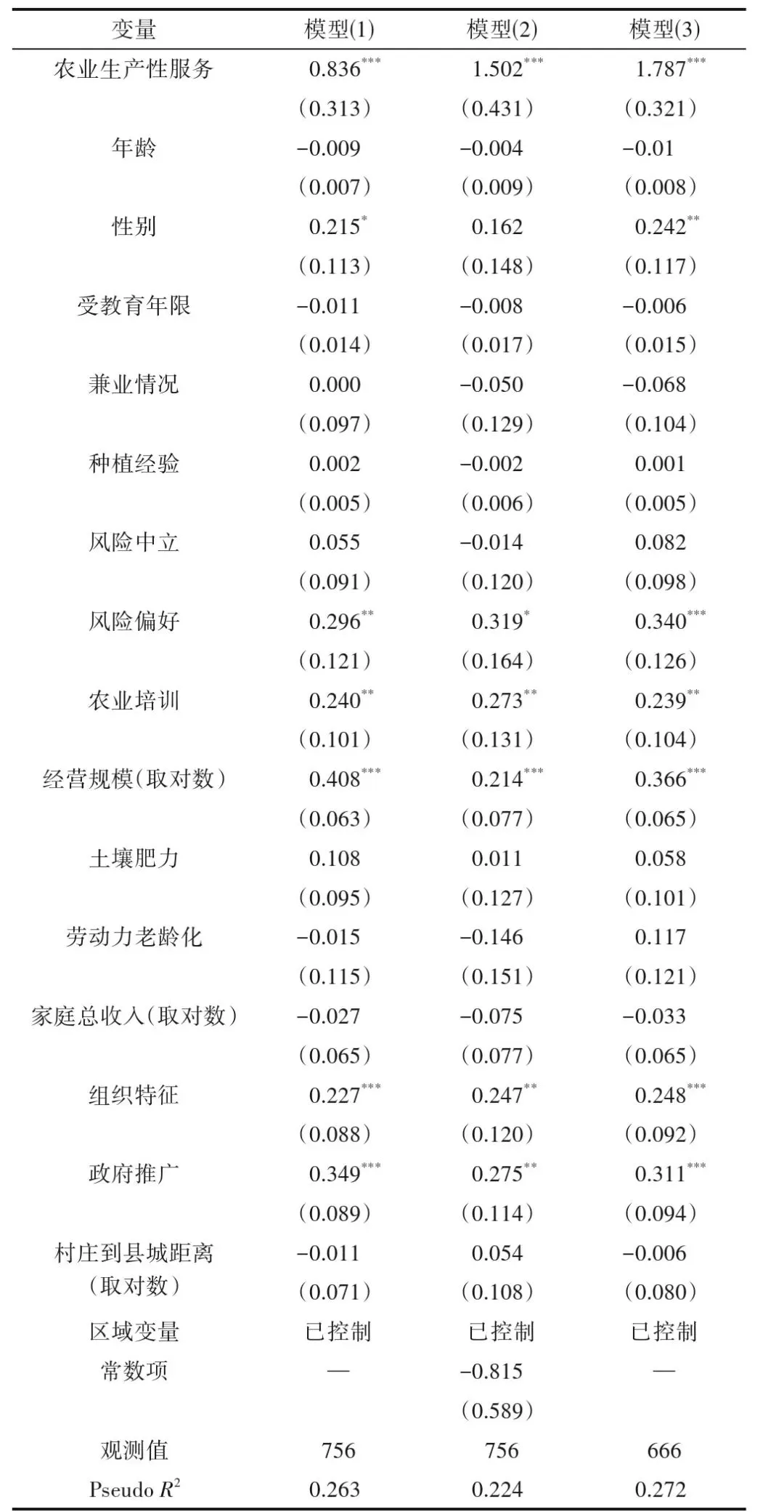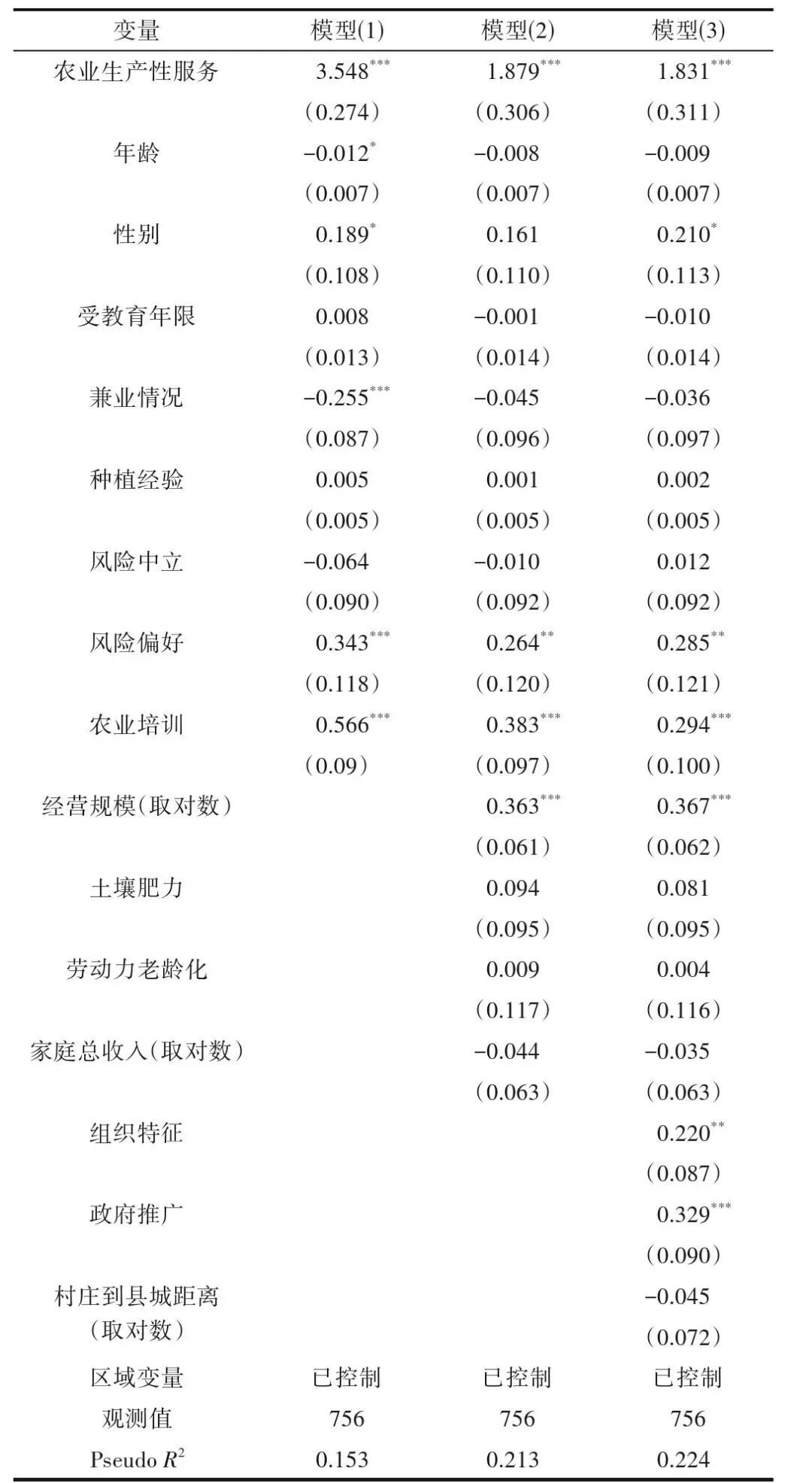 该文选取农户个体特征、家庭特征、土地经营特征和外部条件等作为控制变量,主要包括农户年龄、受教育程度、风险偏好、农业培训情况、经营规模、土壤肥力、农业劳动力老龄化情况、家庭总收入、组织特征、政府推广情况和村庄到县城距离等,同时控制区域变量。