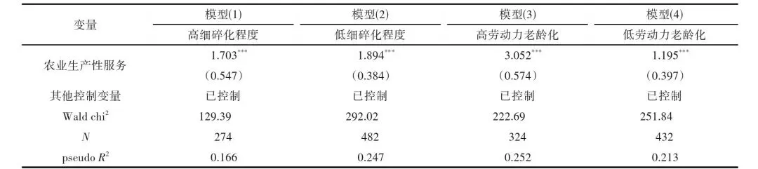 该部分进一步分析农业生产性服务对不同耕地细碎化程度和家庭劳动力老龄化程度影响的异质性。采用耕地块数与经营耕地面积比值测算耕地细碎化程度,家庭60岁以上农业劳动力占总农业劳动力比重衡量劳动力质量。结果见表5,农业生产性服务对不同耕地细碎化特征和劳动力老龄化程度家庭耕地保护技术采纳都有显著影响。