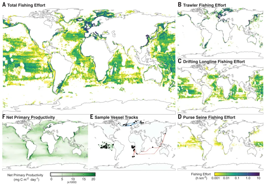 (A)2016年所有AIS渔船的总捕鱼努力量;(B)拖网渔船;(C)延绳钓渔船;(D)围网渔船;(E)不同渔船类型的航迹示例;(F)海洋净初级生产力分布