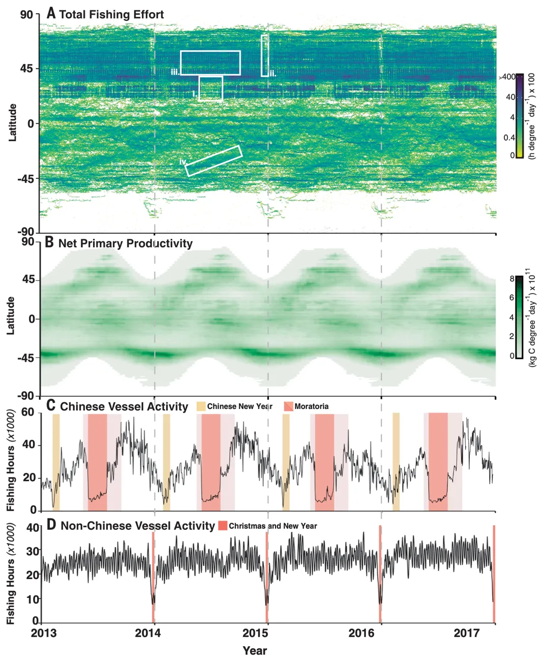 (A)按纬度和日期分布的捕鱼时间;(B)海洋净初级生产力的季节模式;(C)中国渔船活动(受春节和休渔期影响显著);(D)非中国渔船活动(受圣诞假期和周末影响)