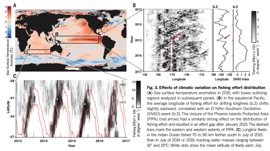2015年,强厄尔尼诺事件和正印度洋偶极子模态同时发生。在赤道太平洋,延绳钓渔船的平均作业经度随ENSO指数向东偏移;同时,凤凰群岛保护区(PIPA)的关闭也产生了类似量级的影响,说明政策因素同样有力地 "重塑" 了渔业空间分布。