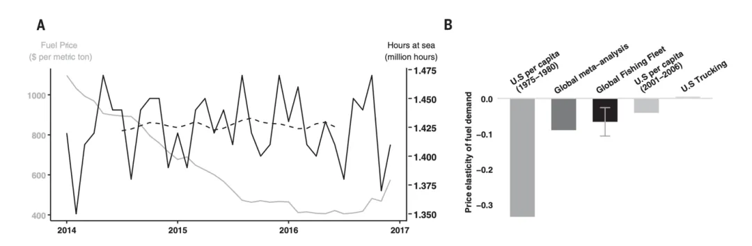 (A)全球船用柴油价格与渔业总出海时间的对比;(B)渔业燃料需求的短期价格弹性