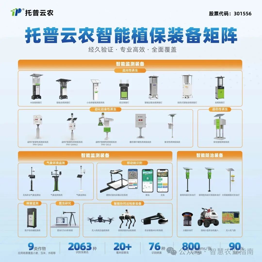 智能虫情测报灯:新增蛛网清洁、苗情采集、作物生育期识别及气象数据采集等实用功能,通过软硬件迭代升级,进一步提升了诱虫能力、图像精度与识别效能,并创新性嵌农业AI智能体“问稷”,深度整合作物生育期、气象环境及历史虫情数据,多维度深度解析虫情发展趋势,让测报更高效、更精准,为病虫害防控提供严谨、全面的决策依据。