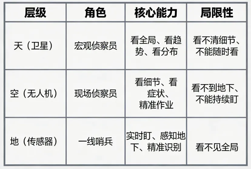 卫星看全局,无人机看细节,地面传感器看根基,三者缺一不可,各有各的用处。