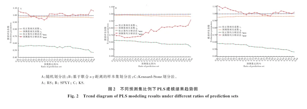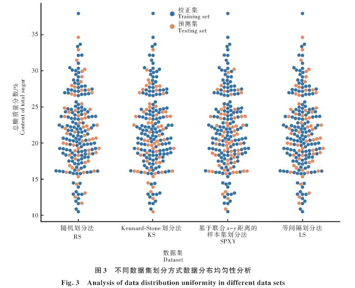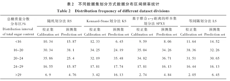 分别用RS、LS、SPXY和KS数据集划分方法对样本进行分割,统计校正集和预测集的分段区间分布频率,绘制校正集和预测集分布散点图,直观展示数据集划分的均匀性。利用PLS回归算法构建定量模型,通过模型效果评价数据集划分方式的优劣。数据集划分比例以预测集占总数据集的比例表示,预测集比例范围为20%~50%,间隔1%递进形成30种数据集划分比例,分别构建PLS定量模型,通过模型效果筛选最佳数据集划分比例。