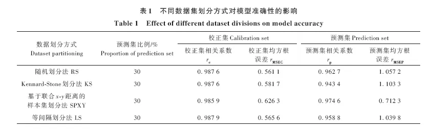 数据集划分是将样本划分为校正集和预测集,校正集样本特征信息的涵盖范围影响模型的预测准确性,而预测集的分布影响模型评价的准确性。数据集划分比例决定了建模数据和模型评价数据的个数,数据集划分比例不合理会直接影响模型的精准度。