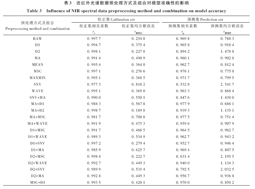 选用一阶导数、二阶导数、移动平均平滑(MA)、均值归一化(MEAN)、多元散射校正(MSC)、极差归一化(MAXMIN)、标准正态变量变换和小波变换(WAVE)8种预处理算法,按照无预处理、单种预处理、组合预处理等方法探讨预处理方法的优劣。组合预处理方式分别采用2~4种预处理方式叠加,通过随机组合形成69种组合方式,包括组合顺序和预处理叠加个数。数据集利用SPXY方式划分数据集,预测集比例为30%。构建模型,并通过相关系数进行评价。