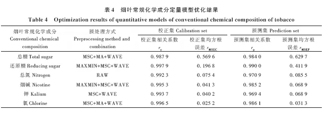 结果表明,数据集通过SPXY方式划分的校正集和预测集分布更均匀,预测集比例为24%时,构建的模型预测能力更强。烟叶总糖和氯离子定量模型最佳预处理组合为MSC+MA+WAVE;还原糖和烟碱定量模型最佳预处理组合为MAXMIN+MSC+WAVE;钾离子预处理组合为MSC+WAVE,总氮则以原始光谱数据构建的模型预测能力最强。因此,烟叶常规化学成分近红外定量模型经过数据集划分和预处理优化后,提高了模型准确率。
