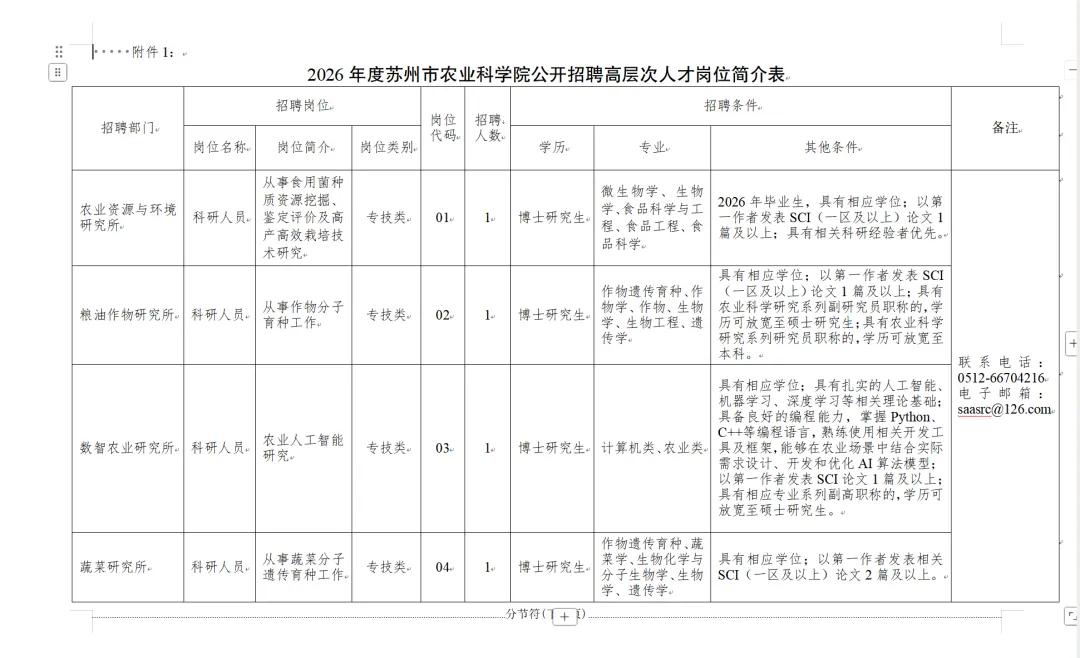 招聘岗位及条件等详见《2026年度苏州市农业科学院公开招聘高层次人才岗位简介表》(附件1),可在苏州市人力资源和社会保障网(http://hrss.suzhou.gov.cn)、苏州市农业科学院网站(http://www.sznky.suzhou.com.cn)查询。二、资格条件