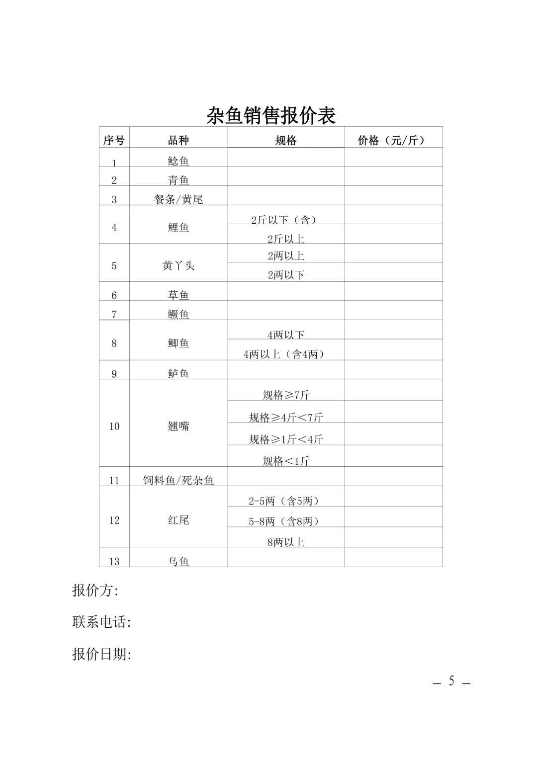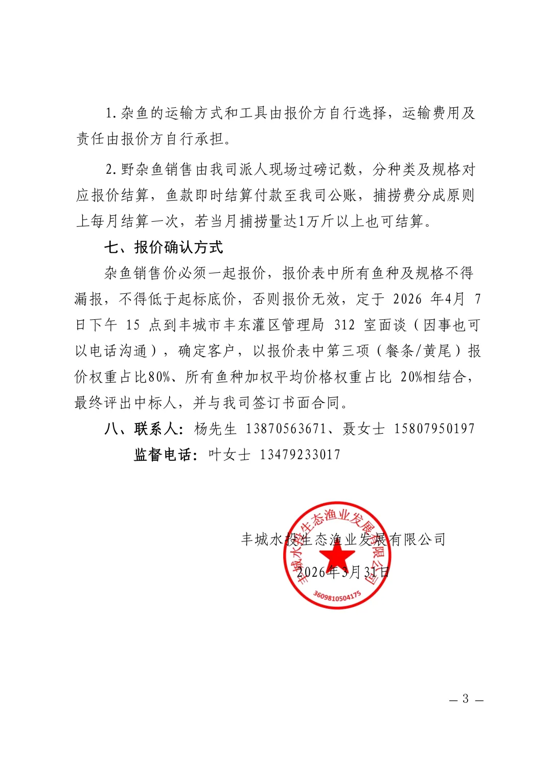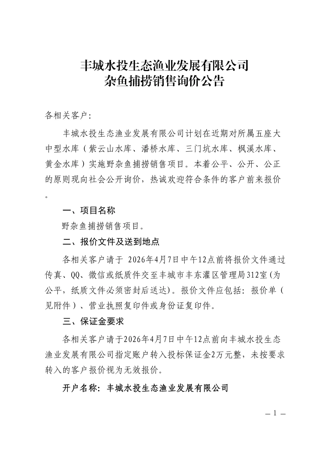 丰城水投生态渔业发展有限公司杂鱼捕捞销售询价公告