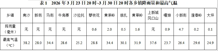 3月23日20时至3月30日20时,全县最大累计雨量为黄草岭乡河顺、小新街(4.7毫米),最高气温出现在南沙镇五帮40.1℃(3月30日)。各乡镇具体情况见表1。