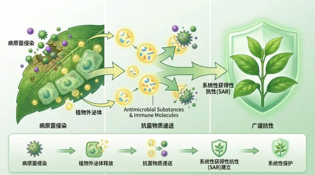 在绿色防控领域,当植物受到病原菌侵染时,外泌体可携带抗菌物质和免疫相关分子抵达侵染部位,有效抑制病原菌生长与扩散,同时参与系统性获得性抗性(Systemic Acquired Resistance,SAR)的建立,使植株整体获得对后续侵染的广谱抗性。这一机制为绿色防控技术研发提供了全新路径,精准契合农业绿色发展对减施农药、生态防控的迫切需求。在耕地质量与微生物资源利用方面,植物外泌体在植物与有益微生物(如丛枝菌根真菌、根瘤菌)的共生建立过程中发挥重要介导作用,为耕地质量提升、微生物资源开发利用提供了全新研究视角。