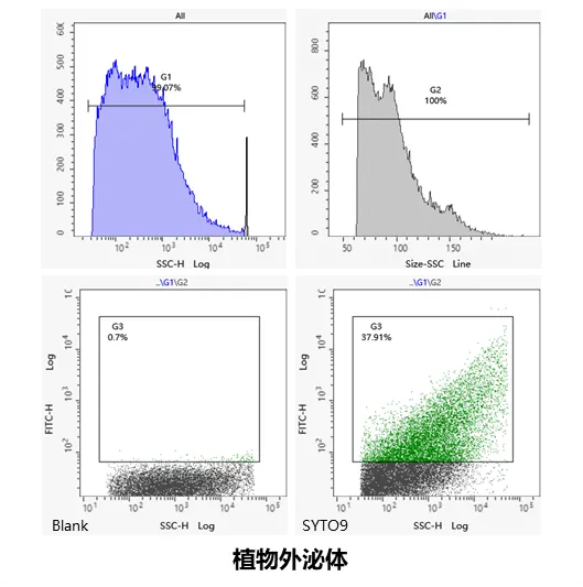 对目标植物外泌体样本进行前期检测,明确样本基础特征:检测结果显示,该植物外泌体平均粒径约97 nm,浓度约1.02×10¹² particles/mL,为后续分选参数设定提供依据;采用SYTO9染料检测外泌体内载核酸包含率,阳性率为37.91%。