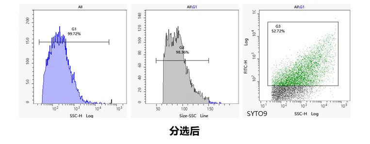 对分选后样本进行回测验证:结果显示,收集所得外泌体平均粒径约92 nm,浓度约3.35×10⁸ particles/mL,直方图峰型显示分选后样本均一性良好;采用SYTO9染料检测外泌体内载核酸包含率,阳性率达52.72%,证实分选后的外泌体仍保留遗传信息,且比例升高,可用于后续功能实验。
