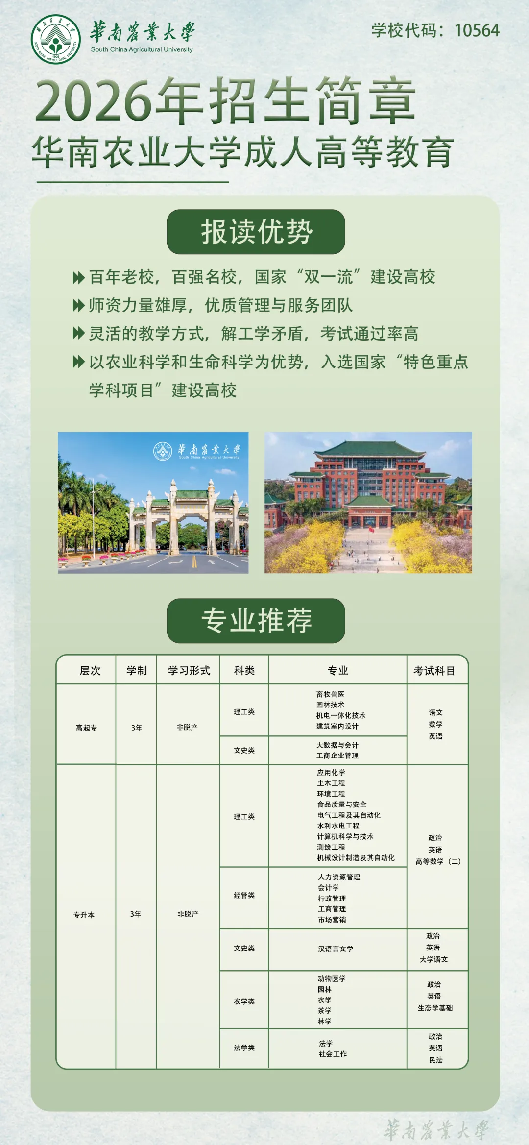华南农业大学是国家“双一流”建设高校,是一所以农业科学、生命科学为优势,农、工、文、理、经、管、法、艺等多学科协调发展的综合性大学。学校以立德树人为根本,以强农兴农为己任,秉承“修德、博学、求实、创新”的校训,弘扬“笃学明德、躬行践履”的丁颖精神。学校学科门类齐全,目前高等学历继续教育办学共有24个本科专业和6个专科专业