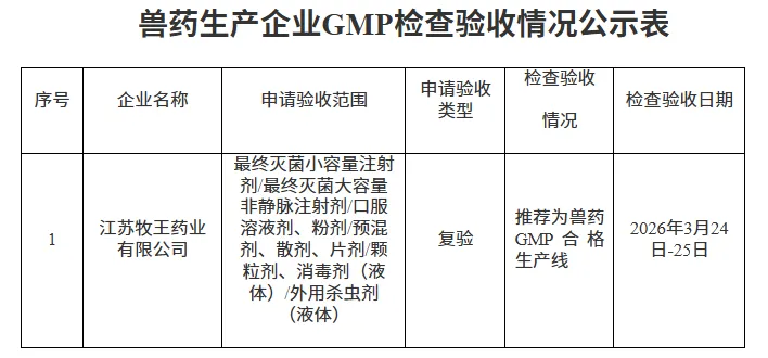 根据《兽药生产质量管理规范》《兽药生产质量管理规范检查验收办法》有关规定,江苏省农业农村厅派出检查组对江苏牧王药业有限公司一家兽药生产企业实施兽药GMP的情况进行了检查验收。现将检查验收情况予以公示,公示时间为2026年3月31日至4月7日。公示期内,如有意见和建议,请实名反馈至江苏省农业农村厅兽医局。