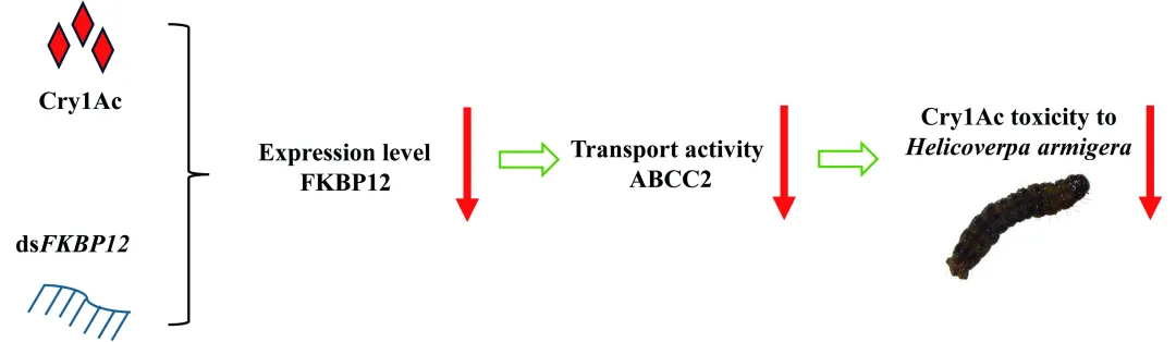 该研究以棉铃虫为研究对象,围绕FKBP12对Cry1Ac毒性的影响及其与ABCC2的相互作用展开系统研究。研究发现,Cry1Ac处理及Bt抗性棉铃虫中FKBP12与ABCC2的表达水平均显著下调;在细胞水平上,沉默FKBP12显著降低中肠细胞对Cry1Ac的敏感性,而过表达FKBP12则显著增强Cry1Ac的细胞毒性。进一步通过酵母双杂交(MbY2H)和免疫共沉淀(Co-IP)实验,研究证实FKBP12可与Cry1Ac关键受体ABCC2直接结合,并影响Cry1Ac毒力。功能分析表明,FKBP12调节ABCC2的转运活性,在ABCC2被干扰的情况下,FKBP12对Cry1Ac毒性的增强作用明显减弱。上述结果首次从分子伴侣调控受体作用角度阐明了FKBP12与ABCC2在Bt蛋白作用机制中的关键作用。