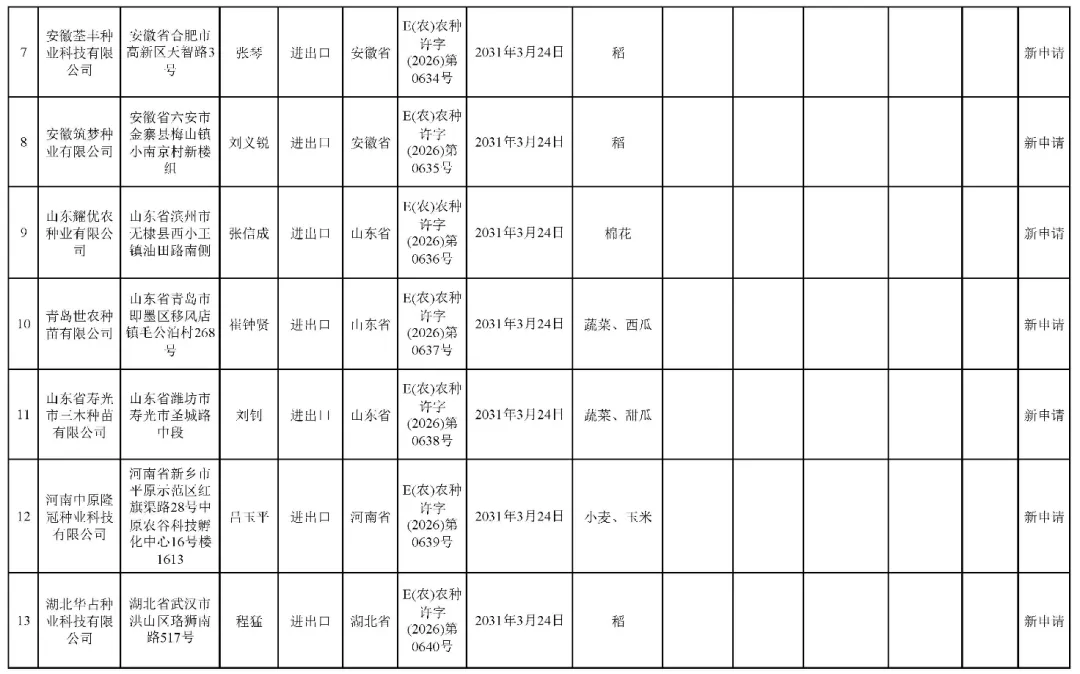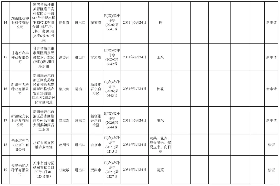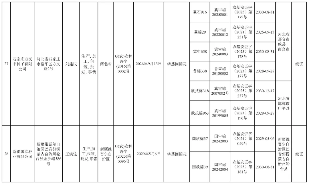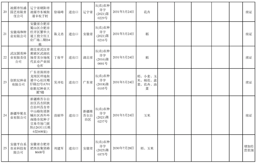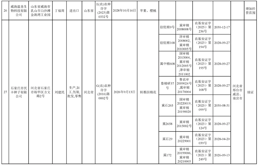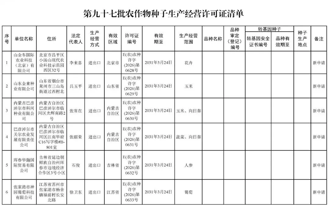 根据《中华人民共和国种子法》及《农作物种子生产经营许可管理办法》等有关规定,批准发放山金车国际农业科技(北京)有限公司等28家企业的28项农作物种子生产经营许可证(详见附件)。