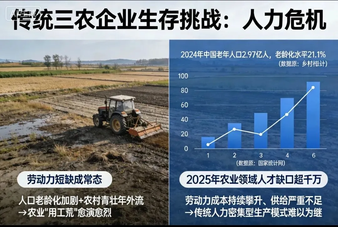 随着人口老龄化加剧与农村青壮年外流,农业“用工荒”愈演愈烈。国家统计局数据显示,2024年我国老年人口达2.97亿人,老龄化水平21.1% 。据乡村振兴网统计,到2025年,农业生产经营、技术操作、信息化等领域人才缺口将超千万 。劳动力成本持续攀升、供给严重不足,传统人力密集型生产模式已难以为继。