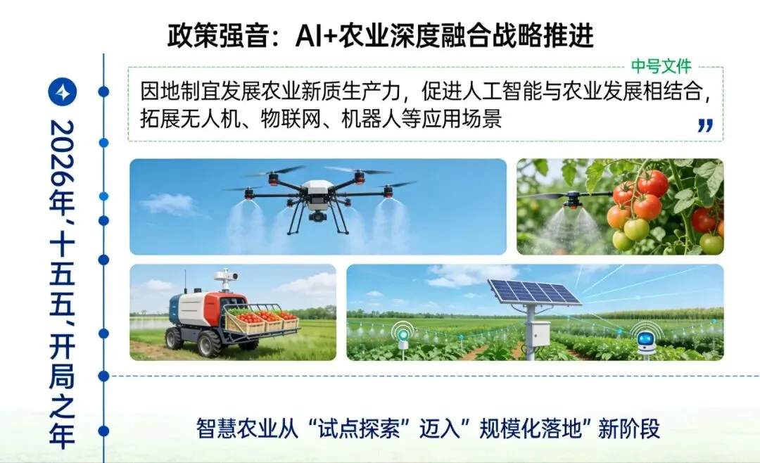 2026年作为“十五五”开局之年,国家接连释放重磅政策,将“AI+农业”推向战略新高地:
