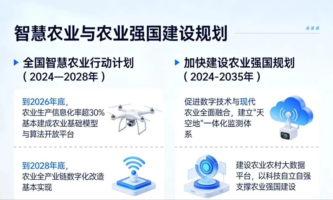 - 《全国智慧农业行动计划(2024—2028年)》设定清晰目标:到2026年底,农业生产信息化率超30%,基本建成农业基础模型与算法开放平台 ;到2028年底,农业全产业链数字化改造基本实现 。