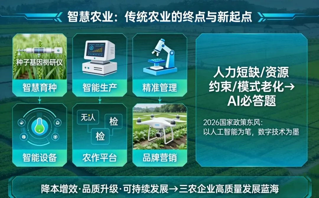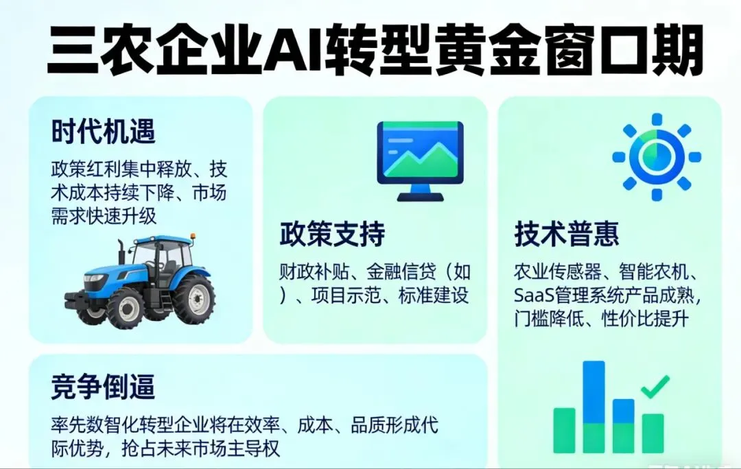 政策红利集中释放、技术成本持续下降、市场需求快速升级,当前正是三农企业布局AI转型的黄金窗口期:
