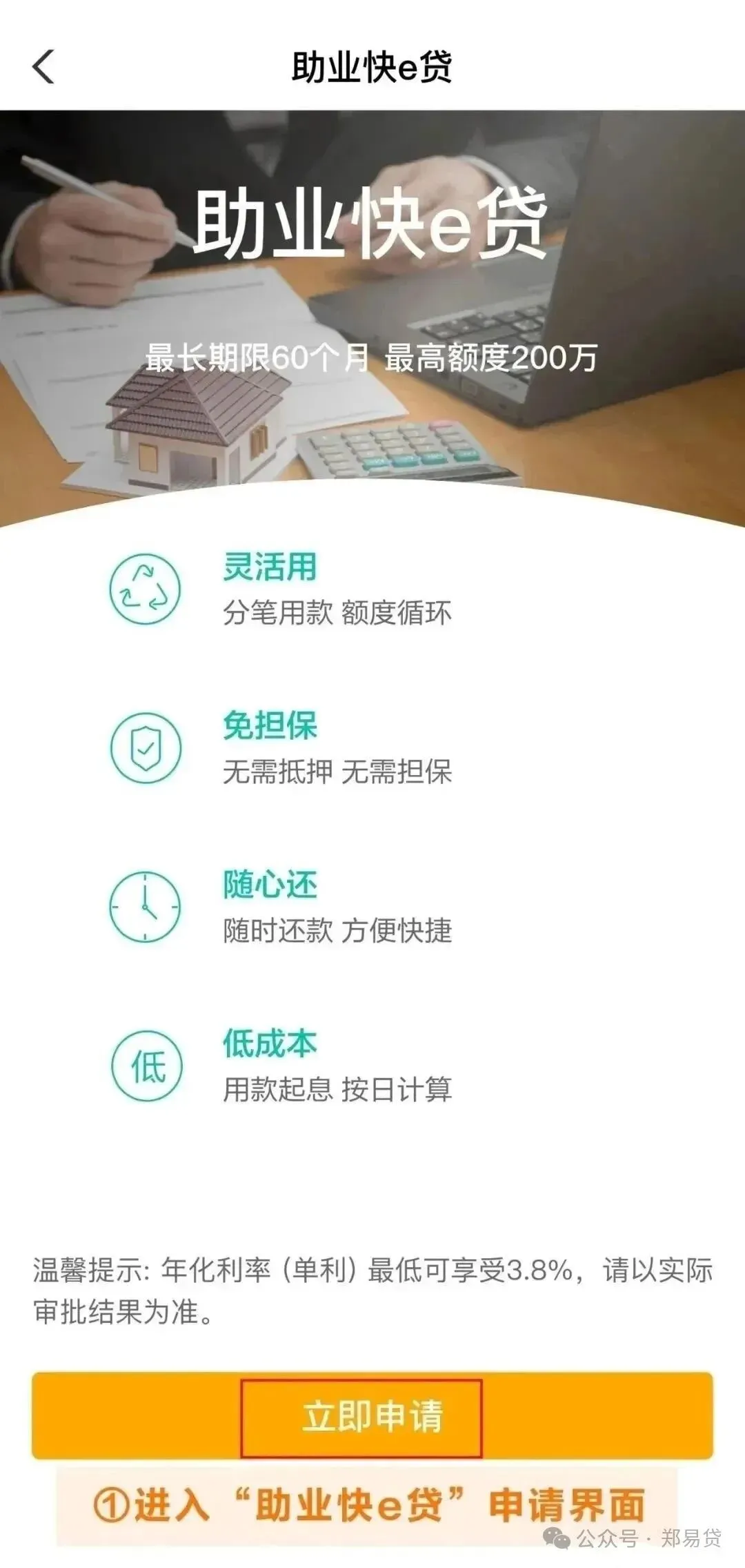 农业银行【助业快e贷】最高 300 万额度,年化利率低至 3.1%起,借款周期长达 3 年,为特定优质商户客群打造的经营贷款。