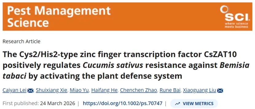 “The Cys2/His2-type zinc finger transcription factor CsZAT10 positively regulates Cucumis sativus resistance against Bemisia tabaci by activating the plant defense system”文章发表在《Pest Management Science》。C2H2型锌指转录因子CsZAT10可通过激活活性氧(ROS)、水杨酸(SA)、茉莉酸(JA)相关的植物防御信号通路,正向调控黄瓜对烟粉虱的抗性,该基因是培育抗烟粉虱作物的新型分子靶点。