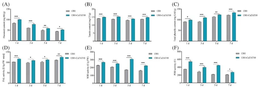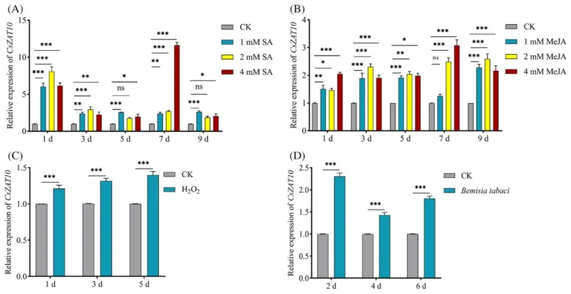 CsZAT10含两个典型C2H2锌指结构域,在黄瓜各生育期和器官均有表达,且受烟粉虱侵染及SA、MeJA、H₂O₂显著诱导;沉默CsZAT10后,黄瓜的ROS积累受抑,SA、JA生物合成及相关防御基因表达下调,防御酶活性和酚类、黄酮类、单宁等抗性物质含量降低,烟粉虱存活率提升32%、寄主偏好性提高52.5%;过表达CsZAT10则出现相反效应,烟粉虱存活率下降40%、寄主偏好性降低41.3%,植物防御系统被全面激活。