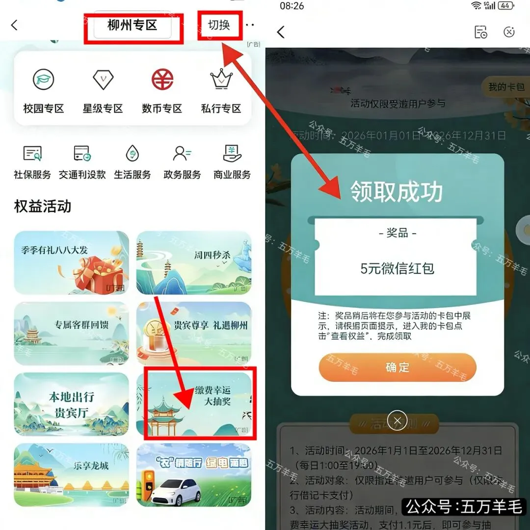 活动路径:农业银行App->城市专区【切:柳州】->缴费幸运大抽奖