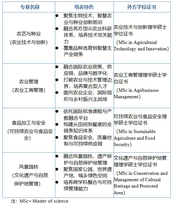 为响应全球粮食安全与可持续发展目标,服务中国乡村振兴国家战略,推动农业科技创新与乡村振兴领域的全球对话与合作,两校强强联合,在本科合作办学基础上,推出硕士教育项目,面向全社会招生。项目致力于融合中英农业教育优势,打造“中外农业高等教育融合创新的标杆平台”,构建国际“产学研”一体化培养模式,着力培养具有国际视野、创新意识与扎实专业能力的高层次、国际化新型农业科技人才。