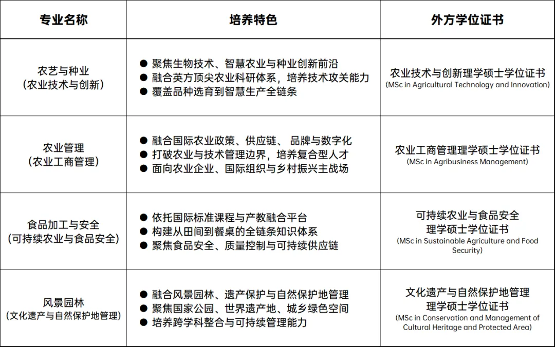 为响应全球粮食安全与可持续发展目标,服务中国乡村振兴国家战略,推动农业科技创新与乡村振兴领域的全球对话与合作,两校强强联合,在本科合作办学基础上,推出硕士教育项目,面向全社会招生。项目致力于融合中英农业教育优势,打造“中外农业高等教育融合创新的标杆平台”,构建国际“产学研”一体化培养模式,着力培养具有国际视野、创新意识与扎实专业能力的高层次、国际化新型农业科技人才。