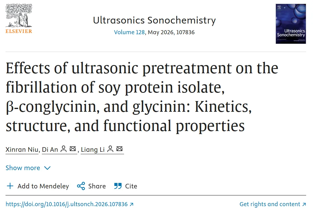近日,东北农业大学的研究团队在食品权威期刊《Ultrasonics Sonochemistry》(IF=9.7)发表题为“Effects of ultrasonic pretreatment on the fibrillation of soy protein isolate, β‑conglycinin, and glycinin: Kinetics, structure, and functional properties”的研究性论文。该论文由东北农业大学食品学院完成,李良教授和安迪教授为该论文的通讯作者。