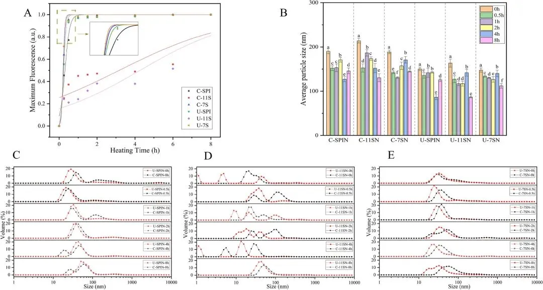图1 A SPI、11S 和 7S 在超声处理(U)与未处理(C)条件下的 ThT 荧光峰值强度。B 加热 0、0.5、1、2、4 和 8 小时后纳米纤维的平均粒径(p < 0.05)。C 加热过程中SPI纳米纤维的粒径分布。D 加热过程中11S纳米纤维的粒径分布。E 加热过程中7S纳米纤维的粒径分布。