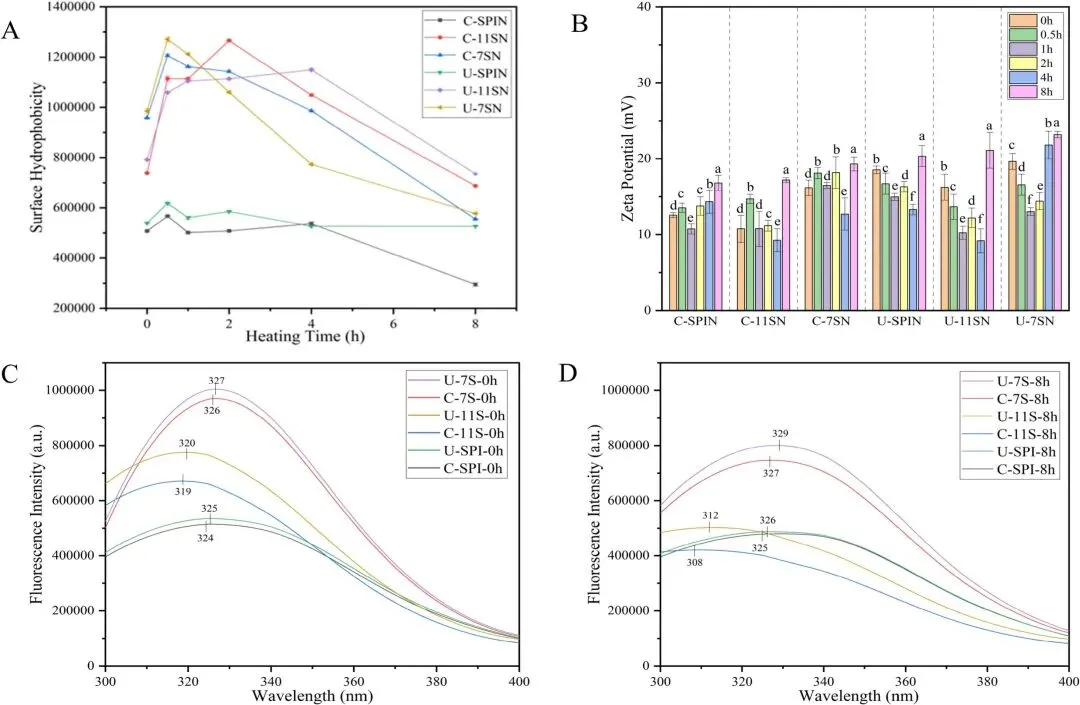 图3A SPI、11S 和 7S 纳米纤维在加热 0、0.5、1、2、4 和 8 小时后,经超声处理(U)与未经超声处理(C)时的表面疏水性。B 纳米纤维在加热0、0.5、1、2、4和8小时时的zeta电位(p < 0.05)。C 纳米纤维在加热0小时时的荧光强度。D 纳米纤维在加热8小时时的荧光强度。