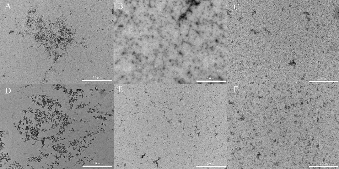 图5 在pH 2.0和85 °C条件下制备8小时的纳米纤维的透射电子显微镜(TEM)图像。(a:C-SPIN,b:C-11SN,c:C-7SN,d:U-SPIN,e:U-11SN,f:U-7SN)。