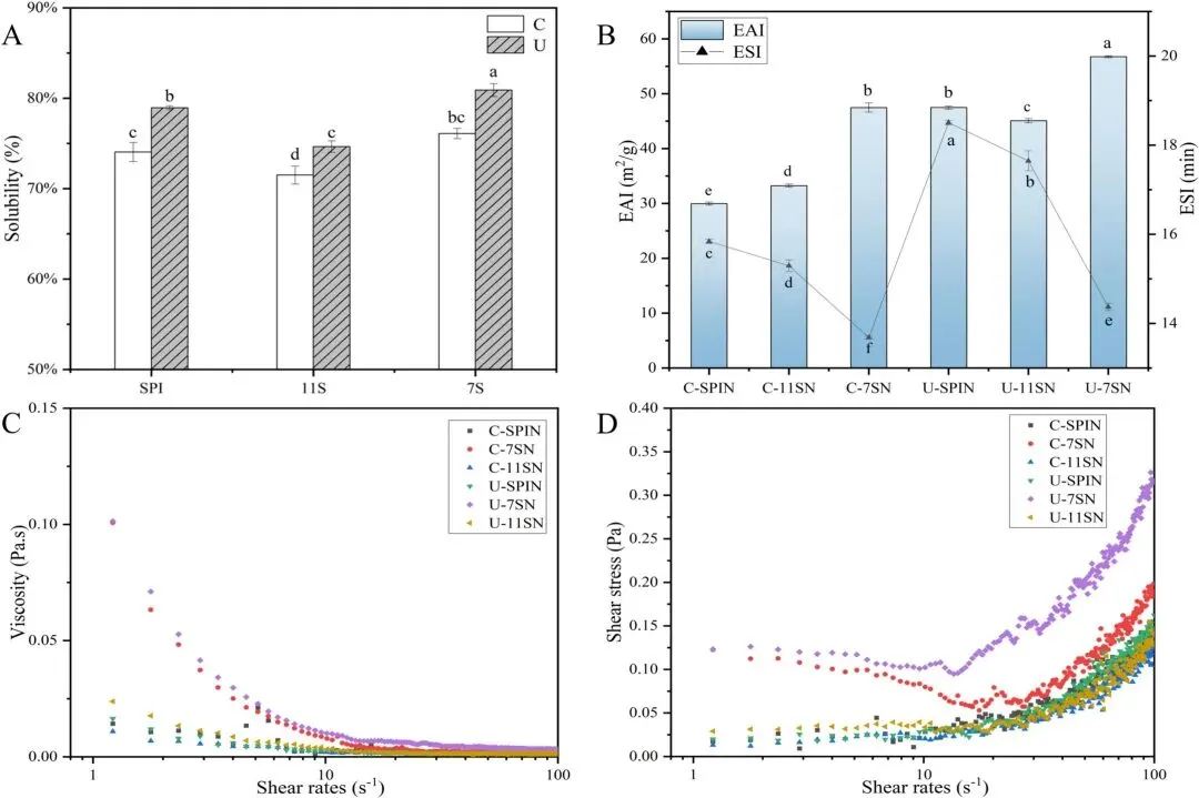 图6 A SPI、11S 和 7S 纳米纤维在超声处理(U)与未处理(C)条件下的溶解率(p < 0.05)。B 六种纳米纤维的乳化活性指数(EAI)和乳化稳定性指数(ESI)(p < 0.05)。C 六种纳米纤维的表观粘度。D 六种纳米纤维的剪应力变化。