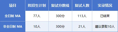 非全日制:进入复试21人,最终建议拟录取10人,复录比约为2.1:1。最高分386分,最低分303分(含加分政策考生)。