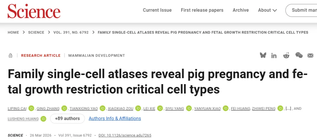 北京时间2026年3月27日,江西农业大学猪遗传改良与种质创新全国重点实验室黄路生院士团队,在Science发表题为 “Family single-cell atlases reveal pig pregnancy and fetal growth restriction critical cell types”的研究论文。