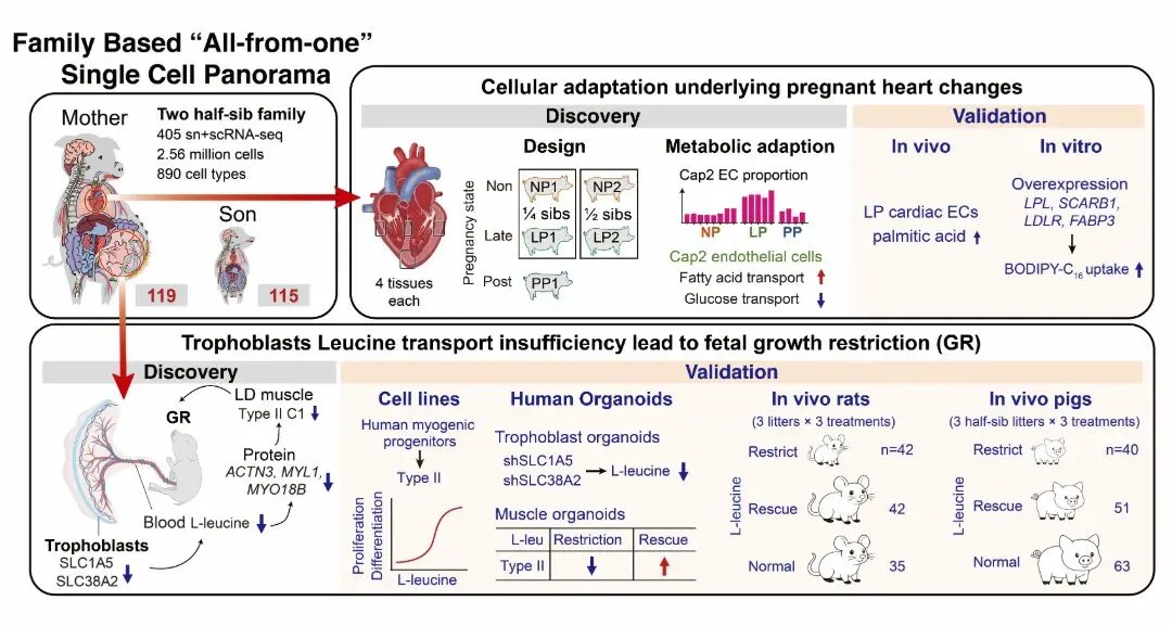 该研究基于“all-from-one”的设计构建了胎儿全身115个组织及其妊娠母猪119个组织的单细胞/单核转录图谱,系统鉴定不同组织及其细胞类型的特异性转录因子;并进一步揭示母胎界面中因胎儿尿囊绒毛膜滋养层细胞L-亮氨酸转运不足而导致胎儿生长受限(fetal growth restriction,FGR)的分子细胞学基础,以及妊娠期间母体心脏能量适应的新机制。